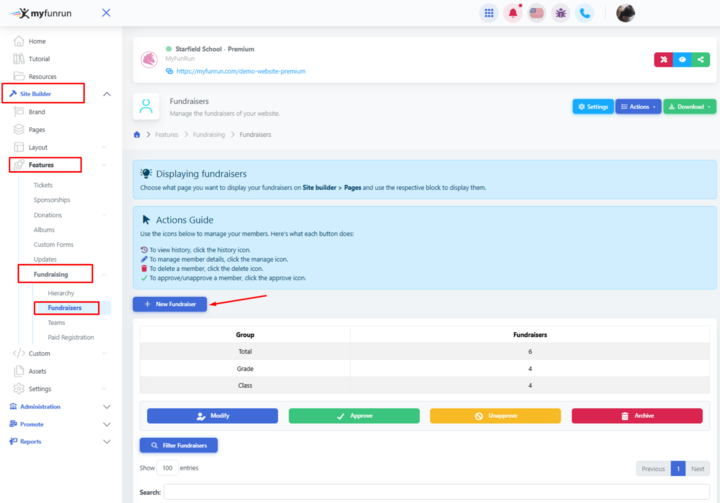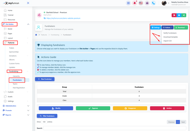 To import your list, go to Site Builder → Features → Fundraising → Fundraisers → Actions → Import CSV.